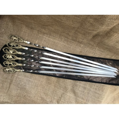 Набір шампурів Звірі 6 шт. Ручки - художнє лиття з бронзи (при використанні РУЧКА НЕ НАГРІВАЄТЬСЯ), покриті теплостійким лаком, шампур виготовлений з харчової нержавіючої сталі 12Х18Н10Т, товщина металу шампура 10х3мм. Загальна довжина шампура з ручкою 58см, Довжина шампура 50см. Набір поставляється в чохлі із щільної тканини